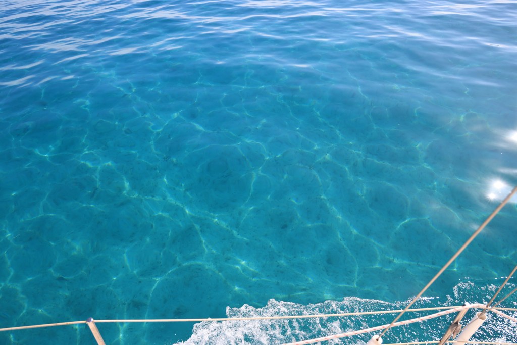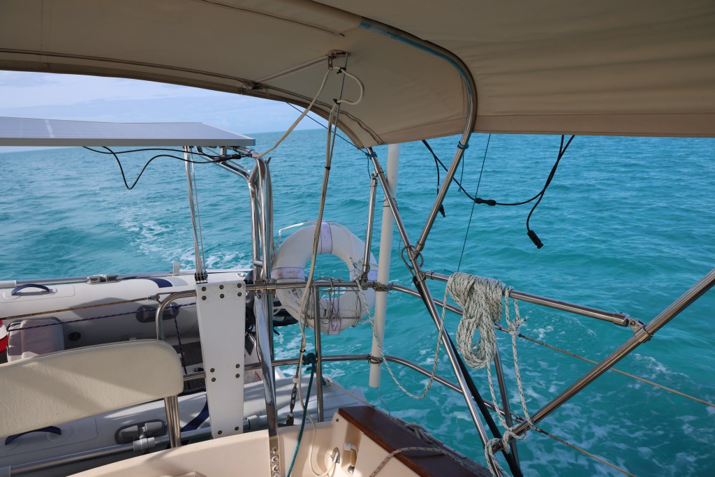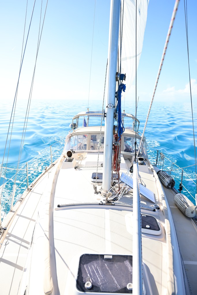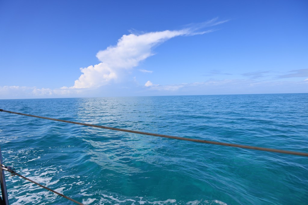 Once the sails were up I was cruising about 6 knots with the motor on. I was so happy because this mean I would for sure get there on time. For hours I just sat and stared at the teal vastness with the island that I came from disappearing. I got comfortable enough to cook some velveta, constantly checking navionics to make sure my autopilot was working. About 5 hours into the trip the wind died and my sails were fluffing. I had to take down the main Jib but I could leave the main sail up because it barely had wind. This part of the trip was incredible. The water was so flat for miles and that’s all you saw for miles and nothing else. No land in site, in. the middle of nowhere 15 miles in all directions.